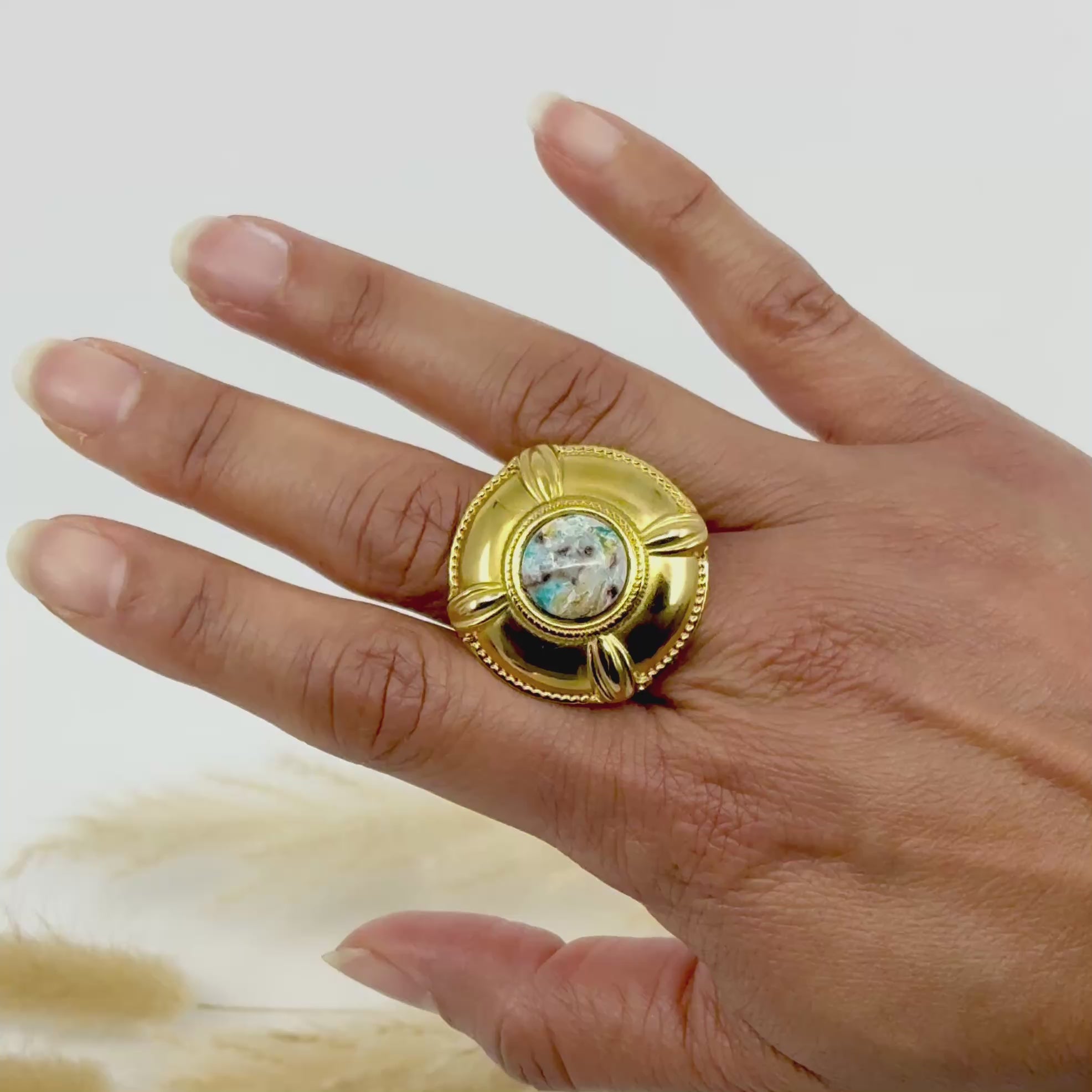 Laissez-vous séduire par l’alliance du doré éclatant et des nuances organiques de cette bague originale, signée Sylvia’s Crafted World.