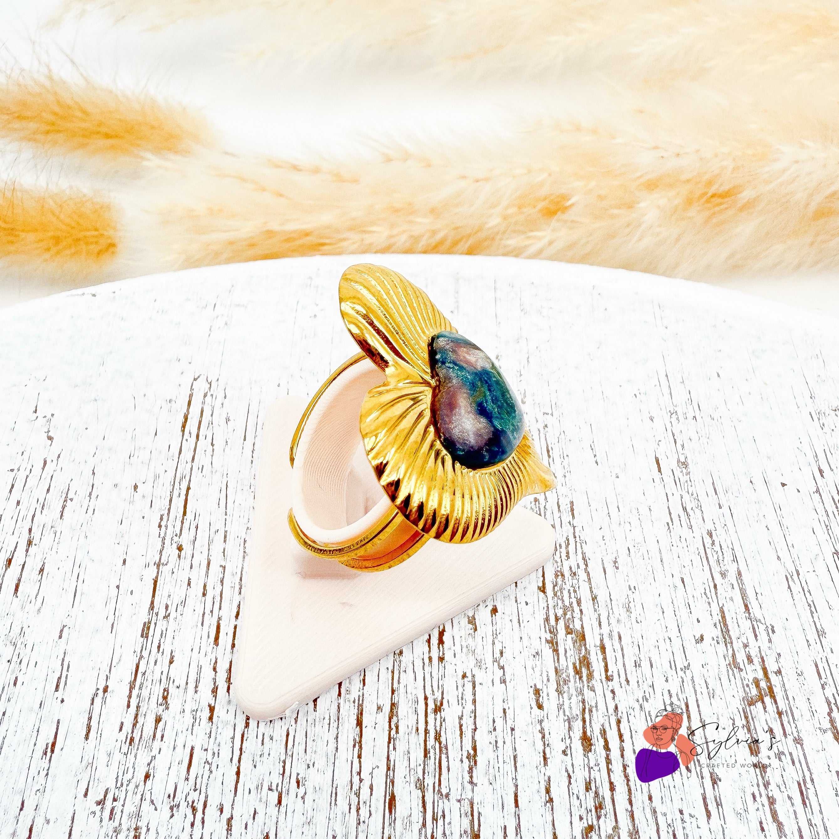 Cette bague artisanale dorée signée Sylvia’s Crafted World célèbre l’art fait main et la beauté intemporelle des bijoux artisanaux français.