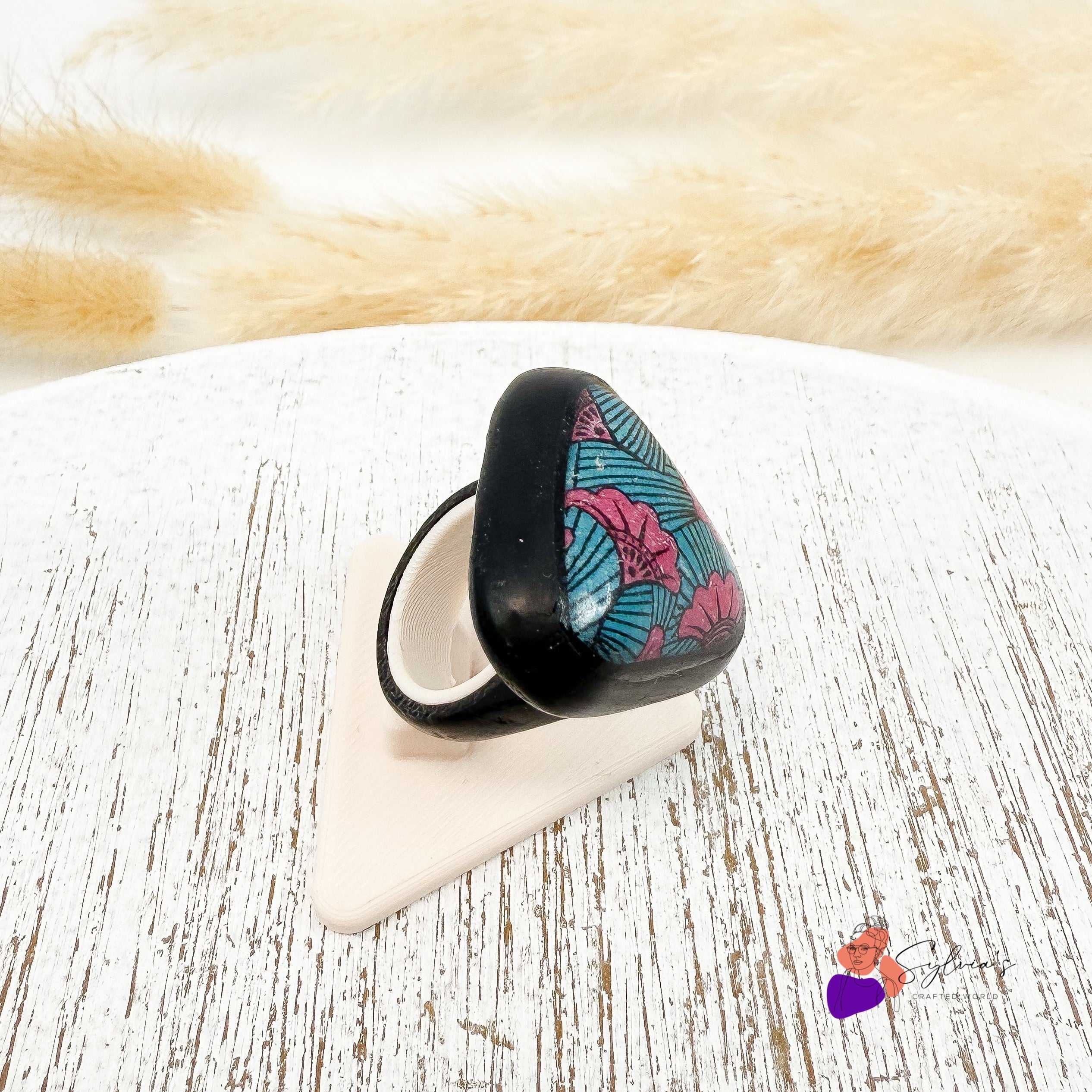 Inspirée des tissus africains (motif fleur de mariage), cette bague unique mêle formes géométriques et teintes vibrantes : un fond noir profond met en valeur des fleurs roses et turquoise, soulignées de lignes fines pour un effet graphique moderne.