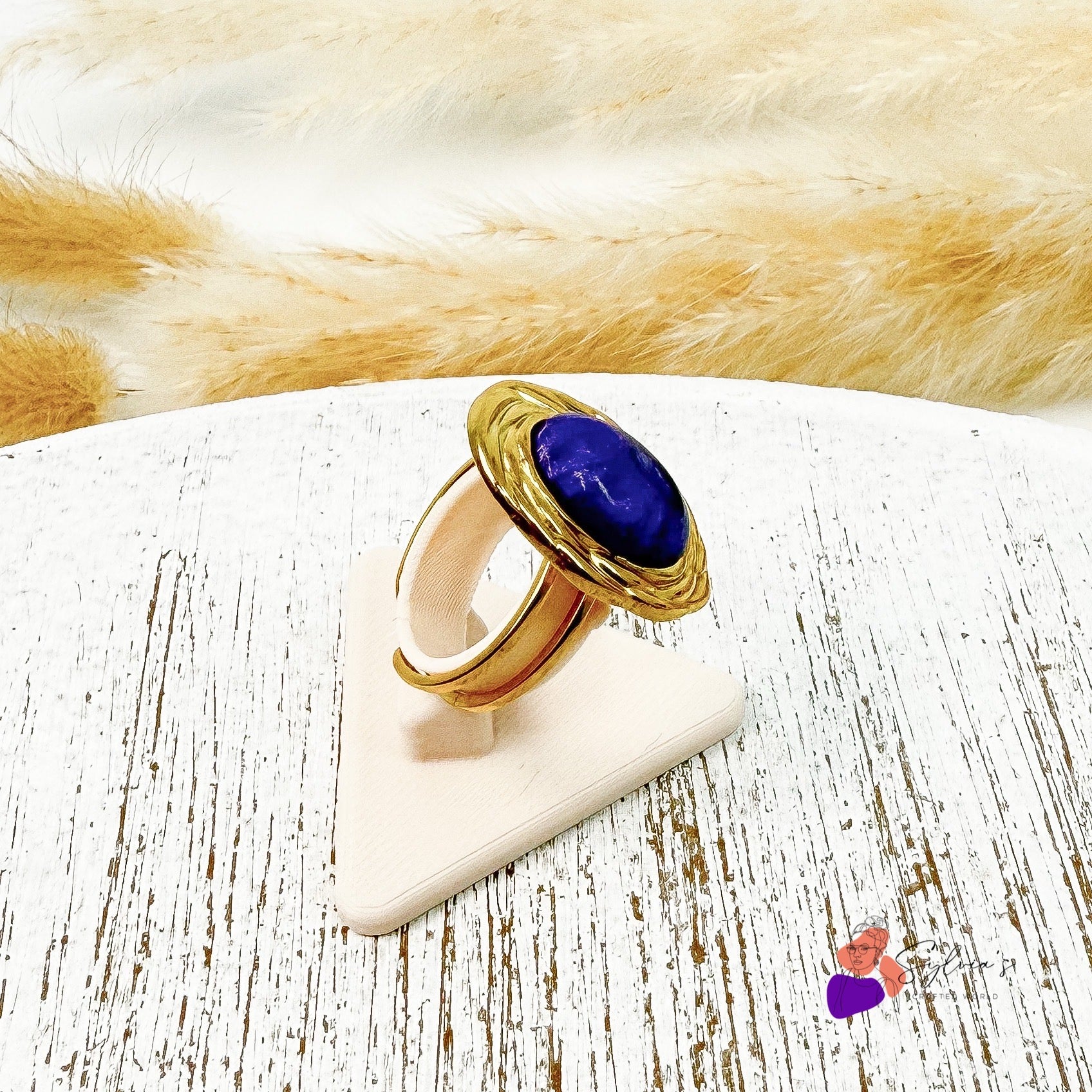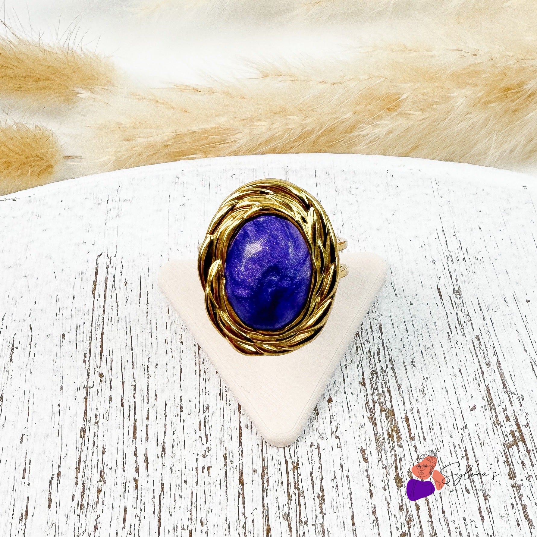 La bague “Amélie” séduit par son charme intemporel et ses reflets profonds. Son cabochon ovale en argile polymère violette, délicatement marbré, est mis en valeur par une monture dorée torsadée en acier inoxydable.